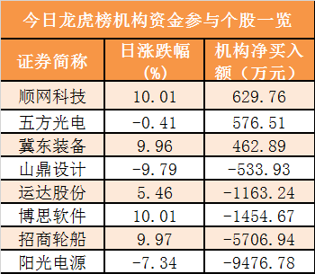 盘后龙虎榜数据显示,机构现身8股,其中顺网科技(18.570, 1.69,10.01%)等3股呈现机构资金净买入,阳光电源(10.610, -0.84, -7.34%)等5股呈现机构资金净卖出。