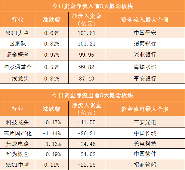 概念板块方面,今日MSCI大盘、国家队、证金概念、陆股通重仓等概念板块资金呈现净流入,其中MSCI大盘概念净流入102.61亿元居首。