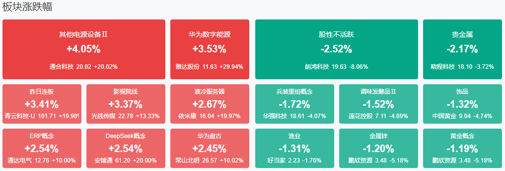 板块方面,影视、DeepSeek、阿里巴巴、数据中心电源等板块涨幅居前,黄金、有色金属、港口、食品等板块跌幅居前。截至收盘,沪指跌0.01%,深成指涨0.07%,创业板指涨0.09%。
