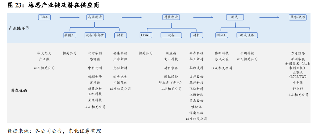 东北证券在4月3日的研报中表示,海思在芯片设计领域全覆盖,多赛道全面开花。按照产业链环节来看,海思在EDA环节的潜在供应商有华大九天、广立微等,晶圆制造和封装制造环节的潜在供应商有北方华创、芯源微、中科飞测、精测电子、富乐德、新莱应材、正帆科技、至纯科技、安集科技、上海新阳、彤程新材、南大光电、广钢气体、新益昌、文一科技、耐科装备、劲拓股份、智立方、兴森科技、华正新材、华海诚科、方邦股份、德邦科技、飞凯材料、艾森股份、唯特偶、深南电路等,测试环节的潜在供应商有伟测科技、苏试试验、长川科技等。