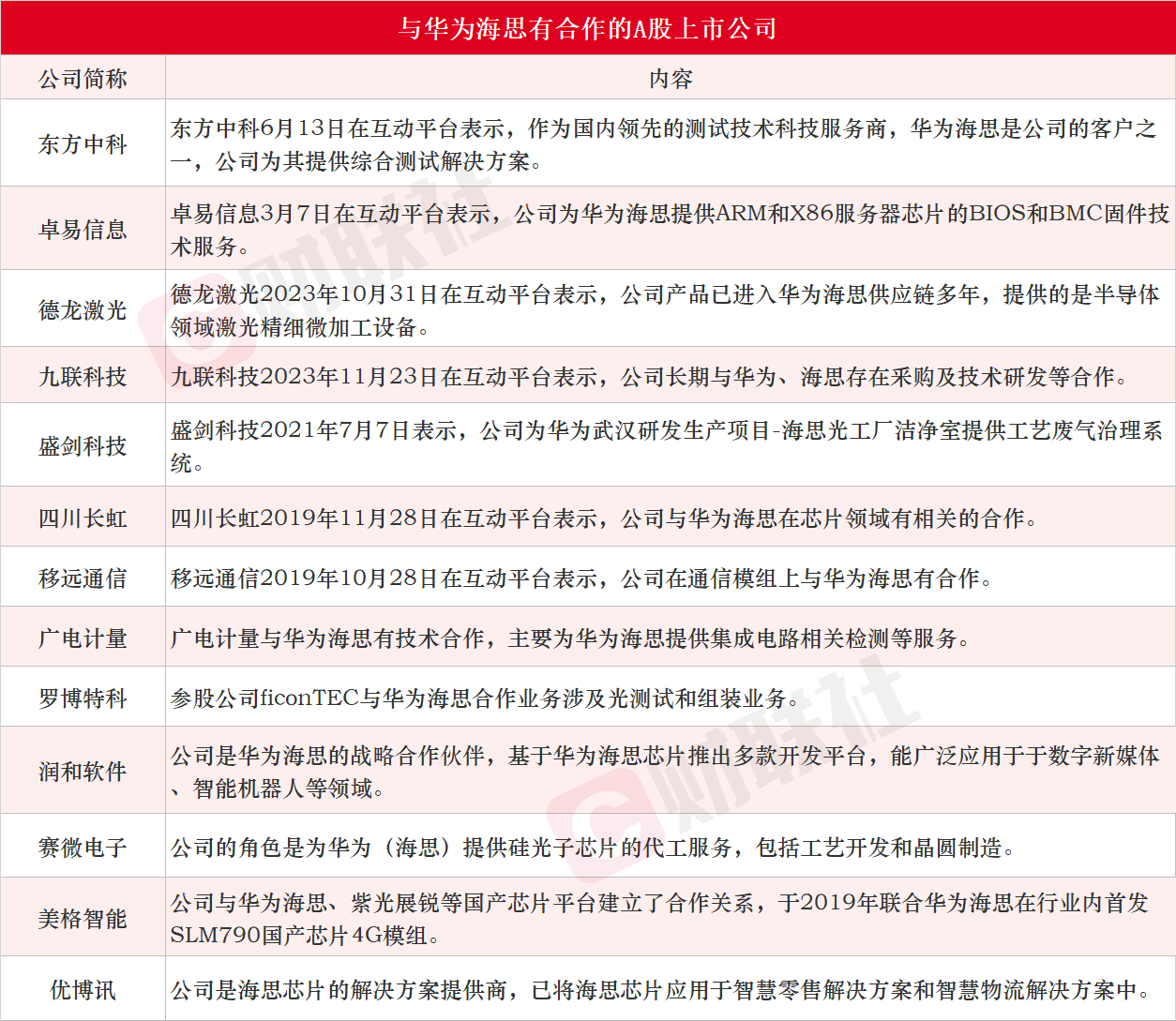 除上述公司外,据财联社不完全梳理,与华为海思有合作的A股上市公司还有东方中科、卓易信息、德龙激光、九联科技、盛剑科技、四川长虹、移远通信、广电计量、罗博特科、润和软件、赛微电子、美格智能和优博讯,详情如下图: