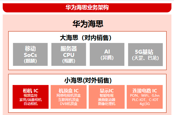 公开资料显示,华为海思分为大海思、小海思。其中,大海思的麒麟(智能手机应用处理器)、巴龙(调制解调器)、 Ascend (人工智能芯片组)、天刚(5G 基站)和鲲鹏(arm 服务器 CPU)是公司的战略布局业务,主要以对内服务为主 。而小海思所布局的监控 IP 摄像头/存储器、移动摄像头、机顶盒,以及显示器和网络相关的芯片是直接向外部客户销售。
