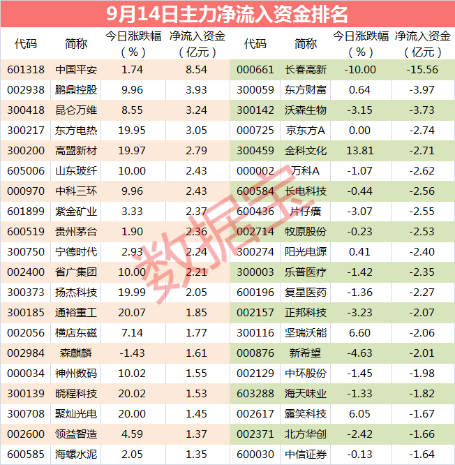 尾盘主力资金净流入15.3亿元。其中,中小板流入2.7亿元,创业板流入19.76亿元。