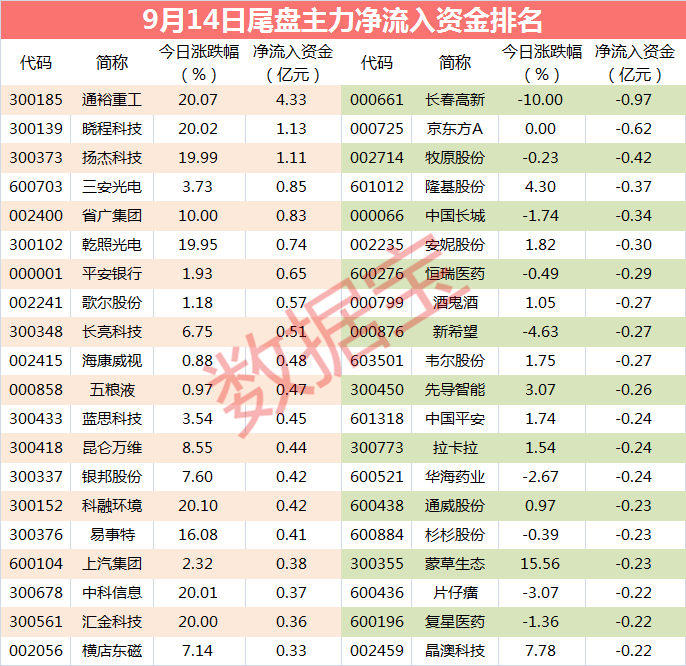 从个股尾盘资金流向数据看,有9股尾盘净流入资金超过5000万元,通裕重工、晓程科技、扬杰科技等个股尾盘资金净流入金额最多,分别高达4.33亿元、1.13亿元、1.11亿元;长春高新、京东方A、牧原股份等个股尾盘资金净流出金额最多。