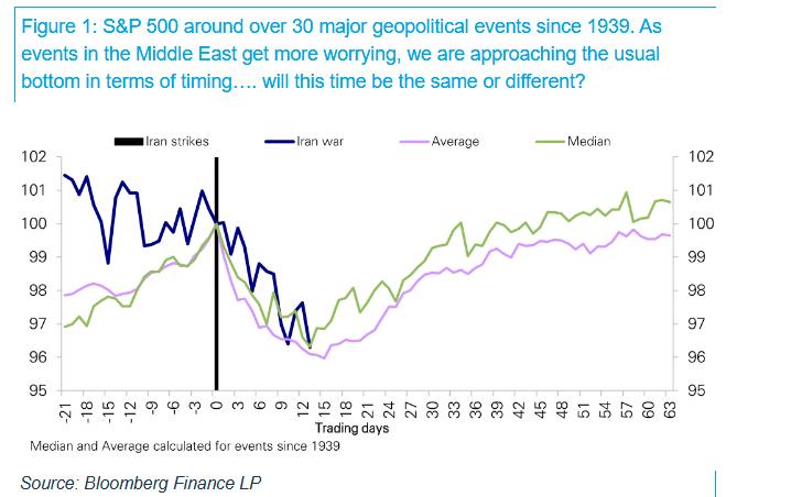 里德展示了标普500指数在30次重大地缘政治事件后的平均表现。“从时间上看,标普500的平均最低点往往出现在初始冲击发生约三周后,而我们现在正接近这个时间窗口,”若统计历次事件中后续出现的最大回撤低点,中位数约为-6%,平均值约为-8%。