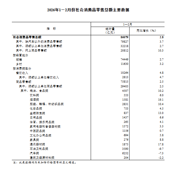 国家统计局:1—2月份社会消费品零售总额86079亿元 同比增长2.8%