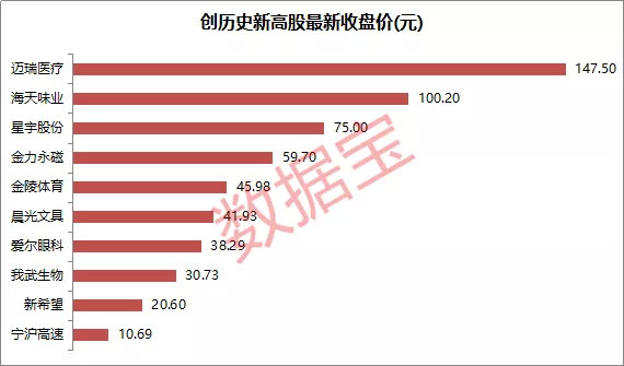 个股来看,以上87股中有10股最新收盘价上市以来新高,包括金力永磁、海天味业、金陵体育、新希望等。具体来看,金力永磁主营高性能稀土永磁材料,受益于稀土永磁概念的爆发,其最新收盘价逆势创新高;海天味业于5月30日股价突破百元,最新收盘价100.2元再创上市以来新高,成为A股调味品公司“巨无霸”。另外,医疗器械龙头迈瑞医疗上周五股价也创上市以来新高,最新收盘价接近150元。