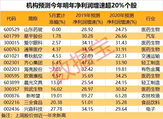 主营饲料生产的新希望今年一季度实现净利润6.66亿元,同比增长10.38%,机构预测今年明年净利润增长率分别高达89.27%,63.28%。从事速冻食品加工的三全食品今年明年机构预测净利润增幅均超过35%;齐心集团、欧普康视及通策医疗机构预测今年明年净利润增幅都超过30%。值得一提的是齐心集团及海亮股份5月份还获北上资金加仓。