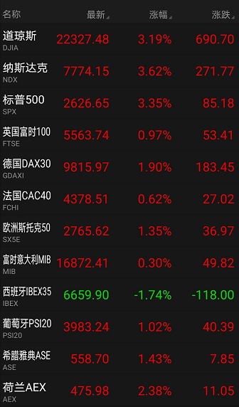 周一,美股一路震荡走高,道琼斯工业指数拉升690点,收涨3.19%,标普500指数和纳斯达克指数分别收涨3.62%和3.35%。欧洲主要股指收盘翻红,英国富时100指数收涨0.97%,德国DAX指数收涨1.9%。