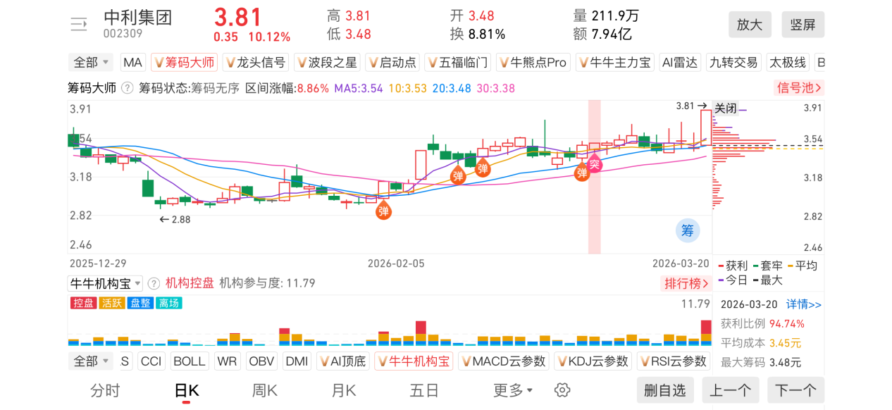 1)20260320-中利集团-002309-【筹码大师】和【牛牛机构宝】-近期出现弹信号且底部量柱由绿转红
