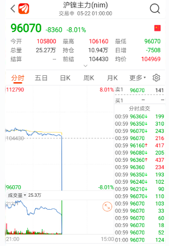 临近凌晨1:00收盘,沪镍期货多个合约突然跳水,其中2006、2007、2011合约跌停,主力合约2007跌8360元,跌幅达8.01%,报96070元/吨。市场猜测此现象或为乌龙指所致,原因尚不明确。国信期货稍早前研报提及,菲律宾、印尼等海外镍矿紧缺态势或将陆续缓解,而从5、6月份不锈钢订单来看终端消费并不乐观。