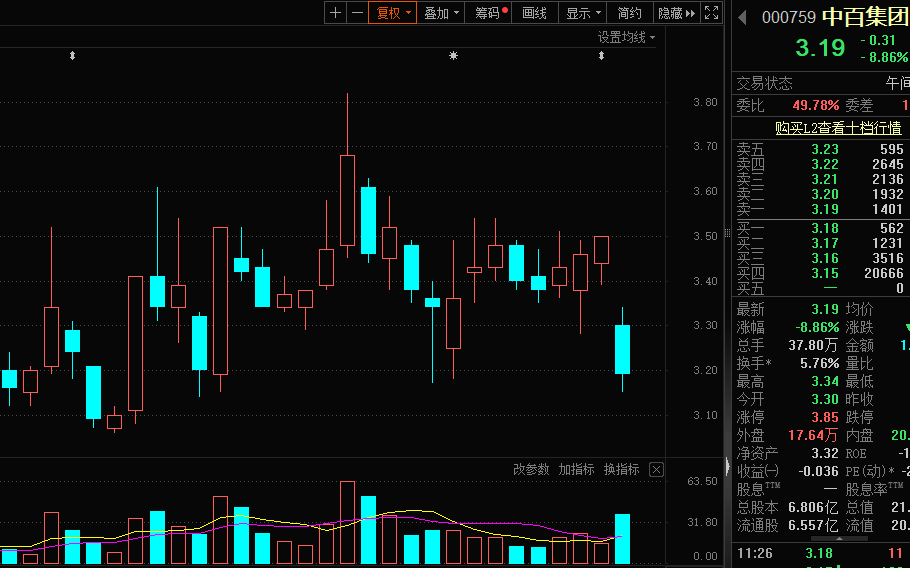 中百集团早盘大跌,盘中一度触及跌停,午间收盘跌幅8.86%。