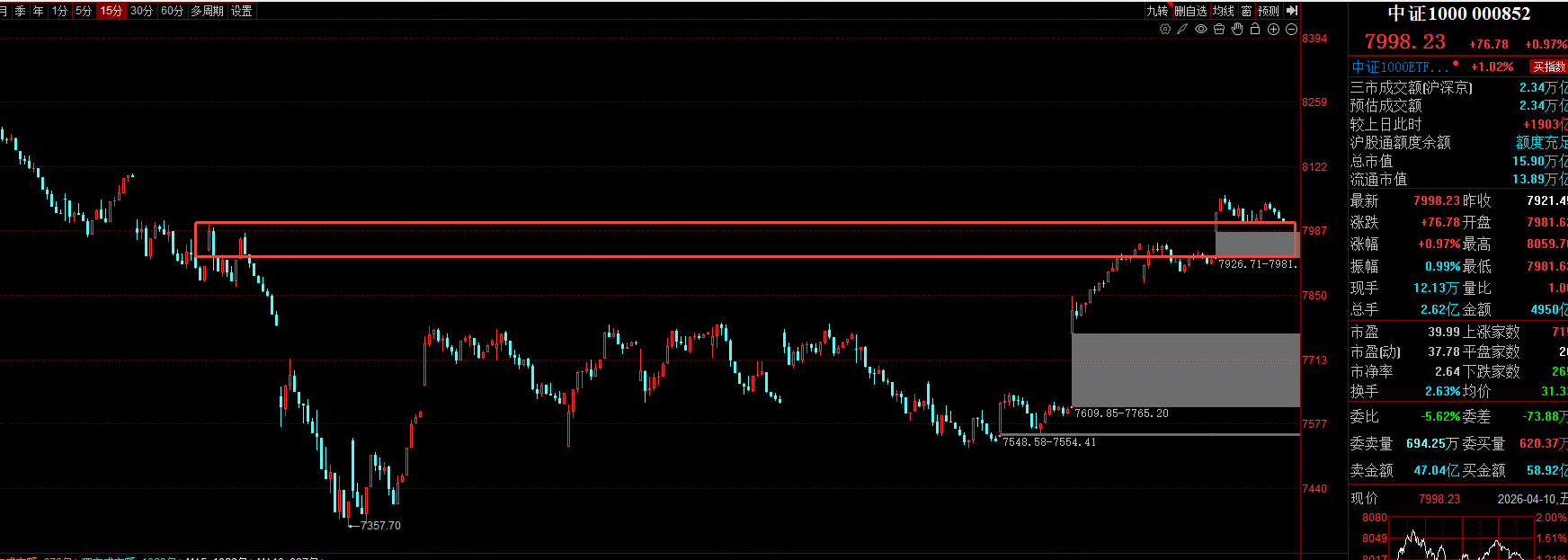 而且从15分钟级别来看,中证1000也有走出15分钟级别的双底结构。