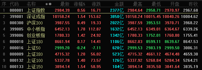 截至收盘,沪指涨0.56%,报收2984.39点;深成指涨1.54%,报收10158点;创业板指涨1.42%,报收1780.33点。值得注意的是,今日上证50下跌0.24%。