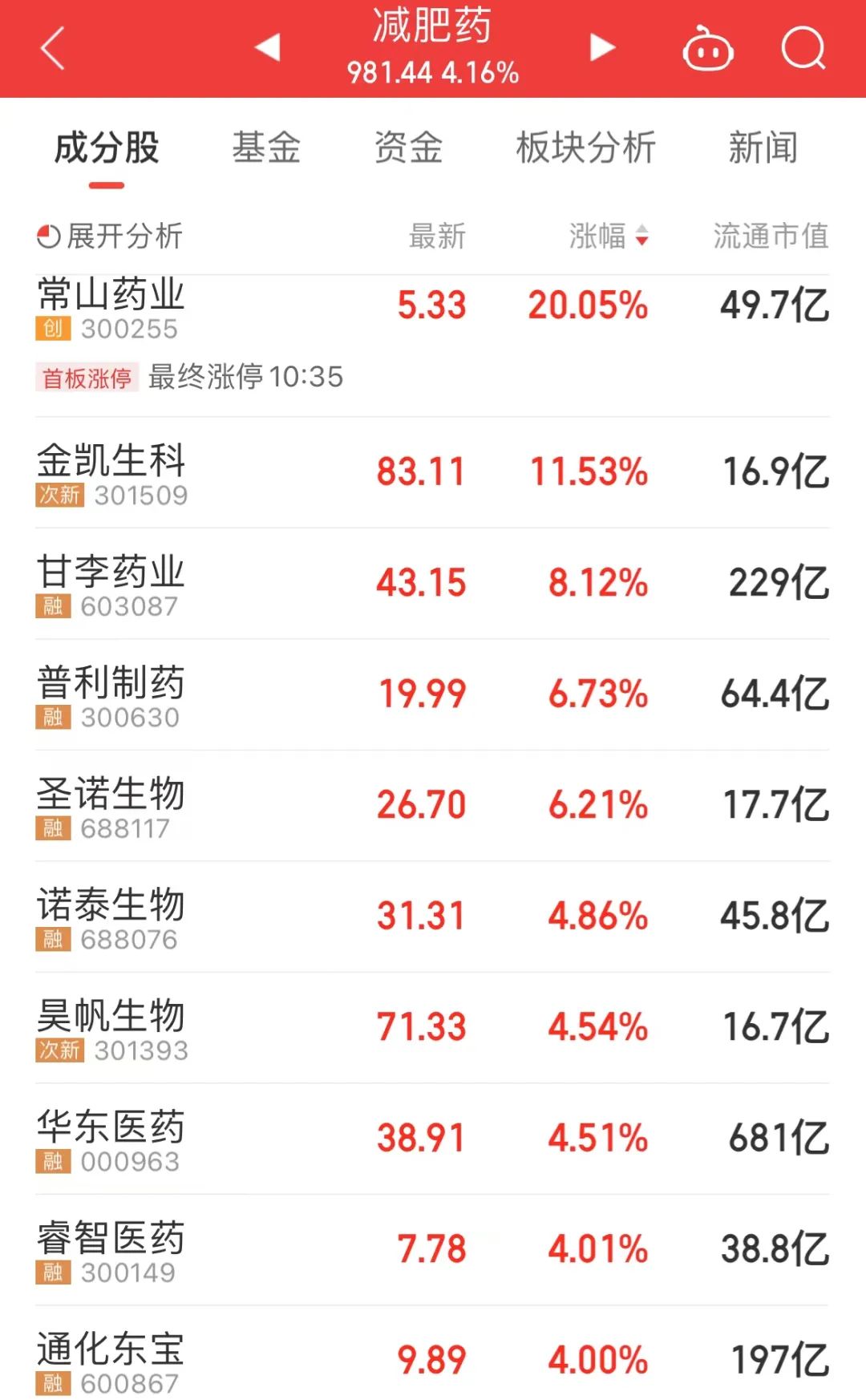 沪指早间震荡反弹,创业板指走势稍弱,医药医疗股持续走高,减肥药方向领涨,常山药业20cm涨停,通化金马、灵康药业封板,金凯生科涨超10%。