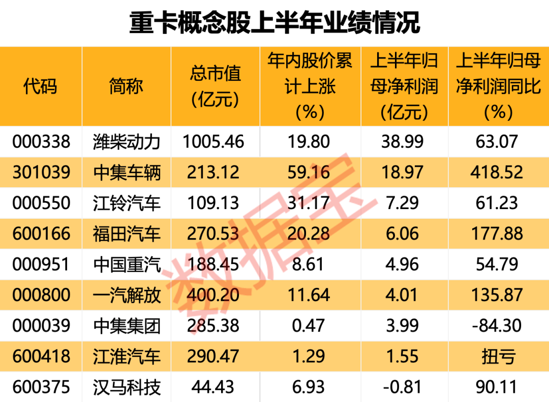 证券时报·数据宝统计,重卡概念股中,仅汉马科技上半年业绩呈现亏损外,其余个股上半年业绩均实现盈利。潍柴动力、中集车辆上半年归母净利润均超10亿元。