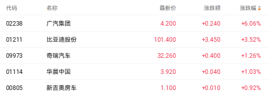 港股汽车股今日表现亮眼。截至发稿,广汽集团(02238.HK)涨6.06%、比亚迪股份(01211.HK)涨3.52%、奇瑞汽车(09973.HK)涨1.26%、华晨中国(01114.HK)涨1.03%。