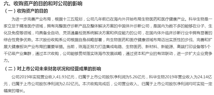 其称,当前,珠海正努力打造集成电路、生物医药、新材料、新能源、高端打印设备等5个千亿级产业集群,通过本次收购,公司能够贯彻落实珠海市发展战略,通过资本和产业的有效联动,进一步扩大企业竞争力。