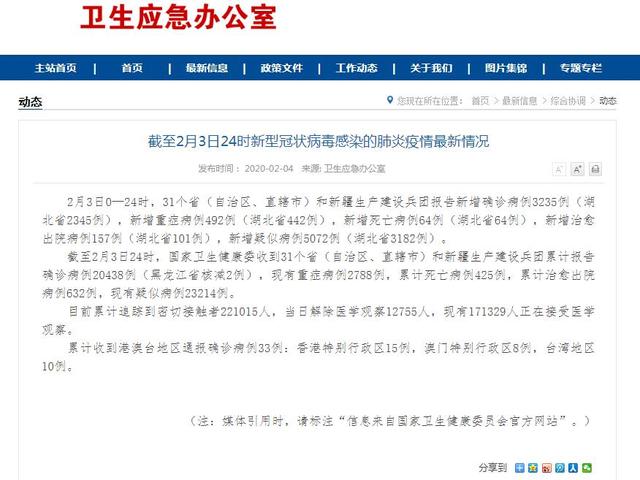 截至2月3日24时,国家卫生健康委收到31个省(自治区、直辖市)和新疆生产建设兵团累计报告确诊病例20438例(黑龙江省核减2例),现有重症病例2788例,累计死亡病例425例,累计治愈出院病例632例,现有疑似病例23214例。