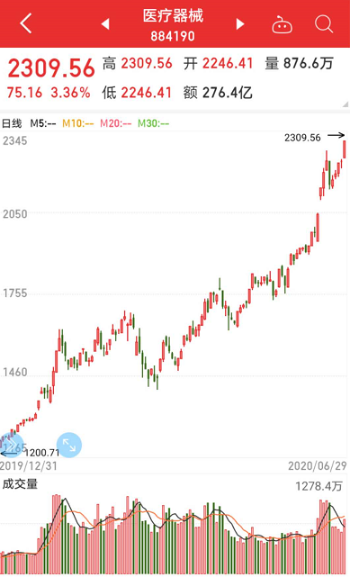 根据医保商会的统计数据,振德医疗连续多年稳居我国医用敷料出口前三名。因疫情影响公司防护用品产品销售大幅增加,振德医疗一季度实现盈利0.86亿元,同比增长180%。振德医疗6月以来重拾活跃,今日午后涨停,最新收盘价创历史新高。累计涨幅翻倍的还有达安基因、三鑫医疗、理邦仪器、蓝帆医疗、宝莱特等。