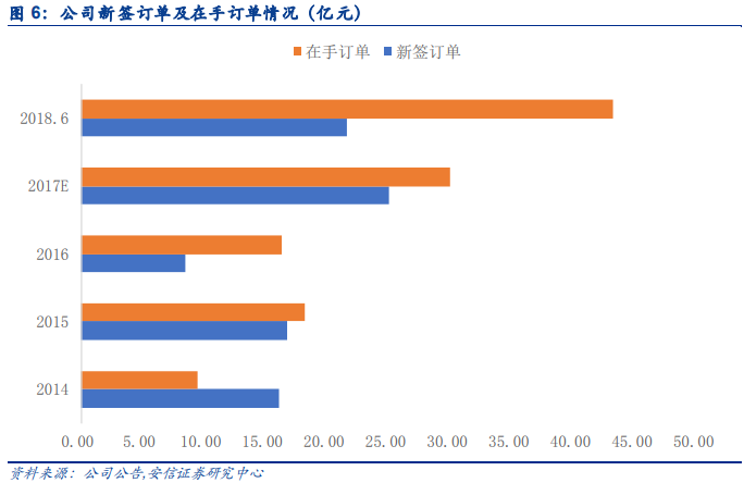 公司自2017年上市以来新签合同高速增长,2016-2018年新签合同金额分别为8.44亿、18.98亿、25.78亿,同比增速分别为124.9%、35.8%(其中2017年全年新签合同未披露,根据2017年Q3累计新签合同12.34亿和公告披露的11月份签订合同6.64亿保守估计)。2019年上半年,公司新签合同59.21亿,是2018年全年的2.3倍。目前,公司在手订单预计在 90 亿元左右,公司订单收入比约为 5.6 倍,公司订单收入比和现金收入比较高,发展弹性十足。