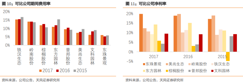 公司净利率处于同行业第一,并且2017年遥遥领先同行;净利率高的主要原因是公司精细管理,整体费用率水平低、在 8 家同行业公司中最低。其次,公司毛利率也在同行中排名靠前,主要是公司设计、研发水平较高,相关业务保持较高盈利水平。而且公司深耕领域为生态湿地,其中又以国家级湿地公园项目为主,多为优质项目,有中央专项补助和政策性银行低息长期贷款,风险低、利润率高。