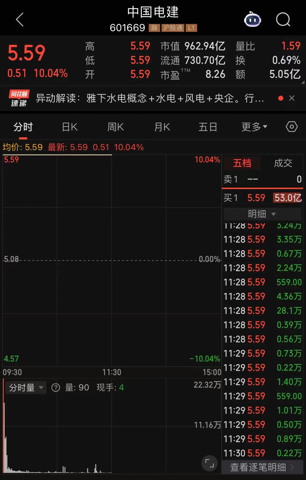 今天上午,大基建行情全面爆发。中国电建(601669)、中国能建(601868)两大龙头股双双“一字”涨停,最新总市值分别为962.9亿元、1063.1亿元。