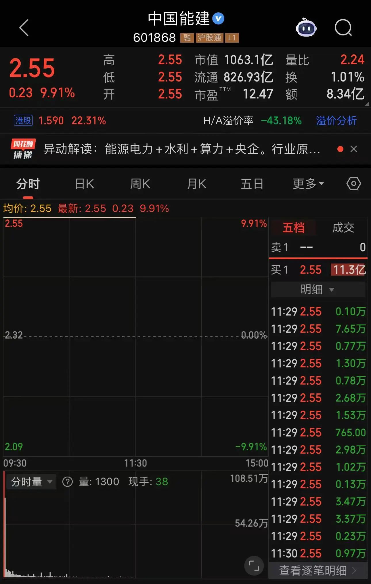 今天上午,大基建行情全面爆发,民爆、工程机械、水利、钢铁等板块大涨。值得注意的是,中国电建(601669)、中国能建(601868)两大龙头股罕见双双“一字”涨停。