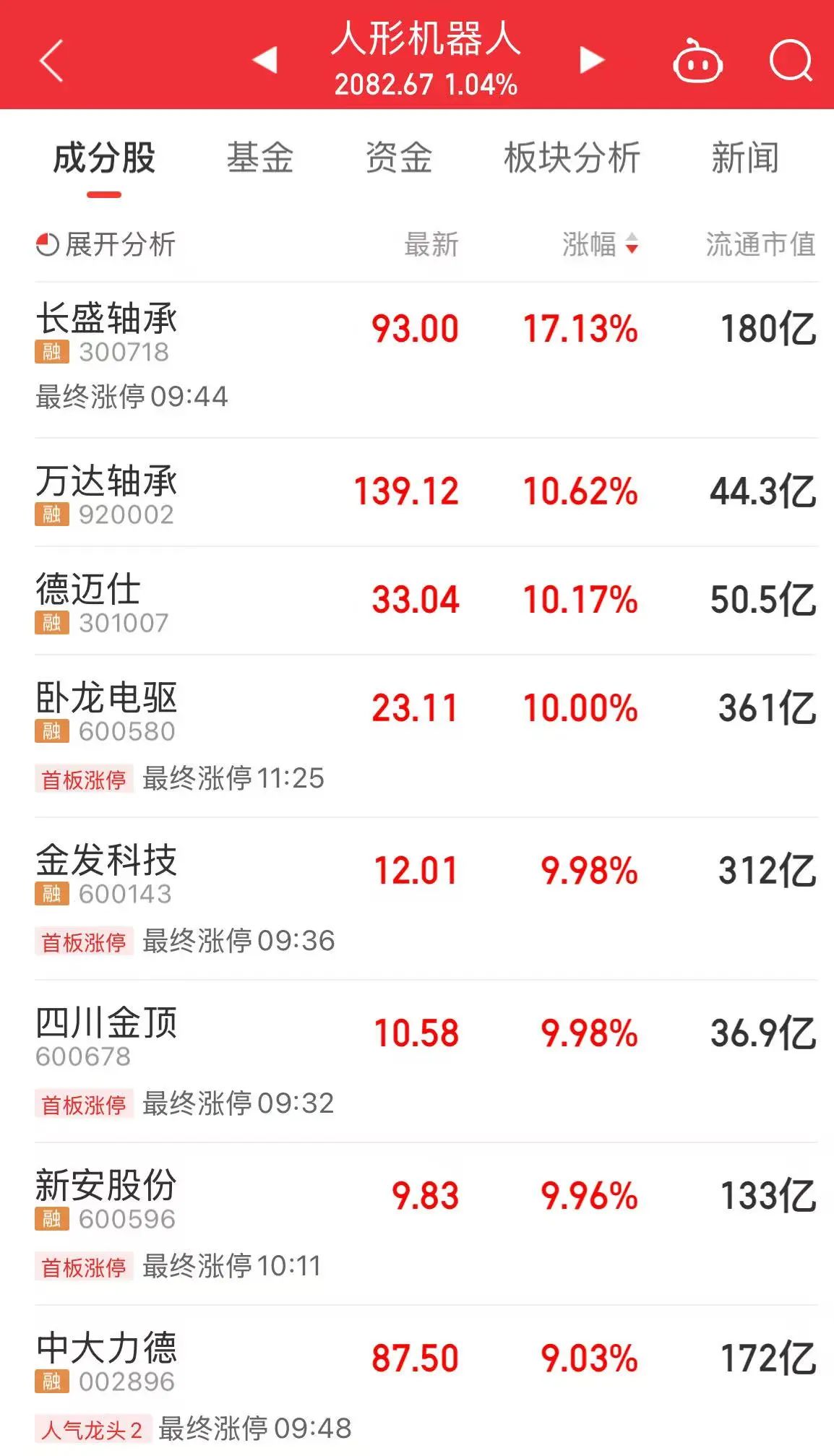 今天上午,人形机器人板块上涨,长盛轴承、万达轴承等个股大涨。