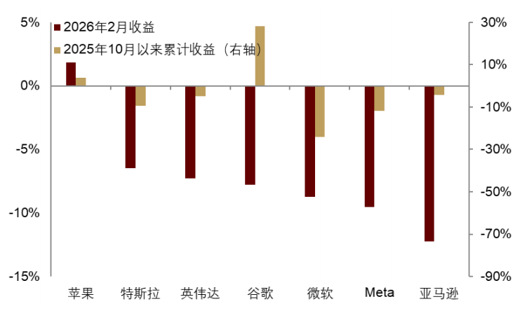其次,AI可能引发的负面宏观影响引发抛售,大盘成长拖累股市。2月市场对AI高投资的可持续性担忧上升,并出现关于AI替代就业可能引发失业潮的恐慌。以美股七巨头为代表的大盘成长整体表现不佳,七巨头中除苹果外均录得下跌,特别是受到AI冲击的软件板块跌幅超过10%。但如果拉长视野来看,美股和软件板块的走弱并不是从2月份开始的,而是去年4季度。从2025Q4开始,美股上涨动能减弱,整体呈震荡行情,七巨头多数开始走弱,而美国软件板块也已经开始下跌势头,且在2月之前从高点已经累计下跌18%。而2025Q4正是前文所述美国准备金规模跌破“充裕流动性”下限的开始时点。因此,当前美股偏弱运行和AI恐慌交易都离不开美国流动性紧张的大背景,是市场情绪和资金脆弱模式下对负面叙事的应激反应。