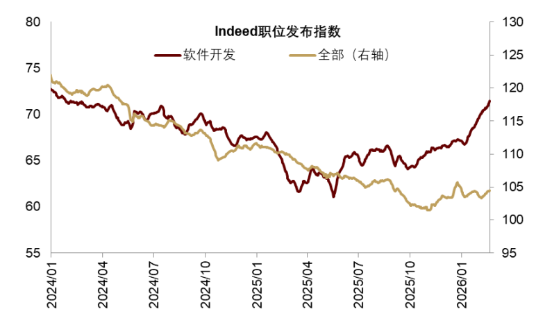 从数据来看,目前AI对美国劳动力市场尚未呈现出整体的负面影响,整体影响并不显著。中金公司综合各行业对AI的暴露程度和美国2023年以来的分行业就业情况,发现两者存在弱倒U型关联,但并不显著。一方面,AI暴露程度较高的部分行业如计算机及外围设备制造就业降幅较大,但同时软件开发的就业招聘情况又明显好于就业市场整体水平。另一方面,高AI暴露度以外的行业就业增速与AI暴露程度呈同向关系,AI暴露程度增加反而促进就业。整体来看,AI进步带来的就业影响是异质性的,对不同的行业有所不同,目前整体影响并不显著。