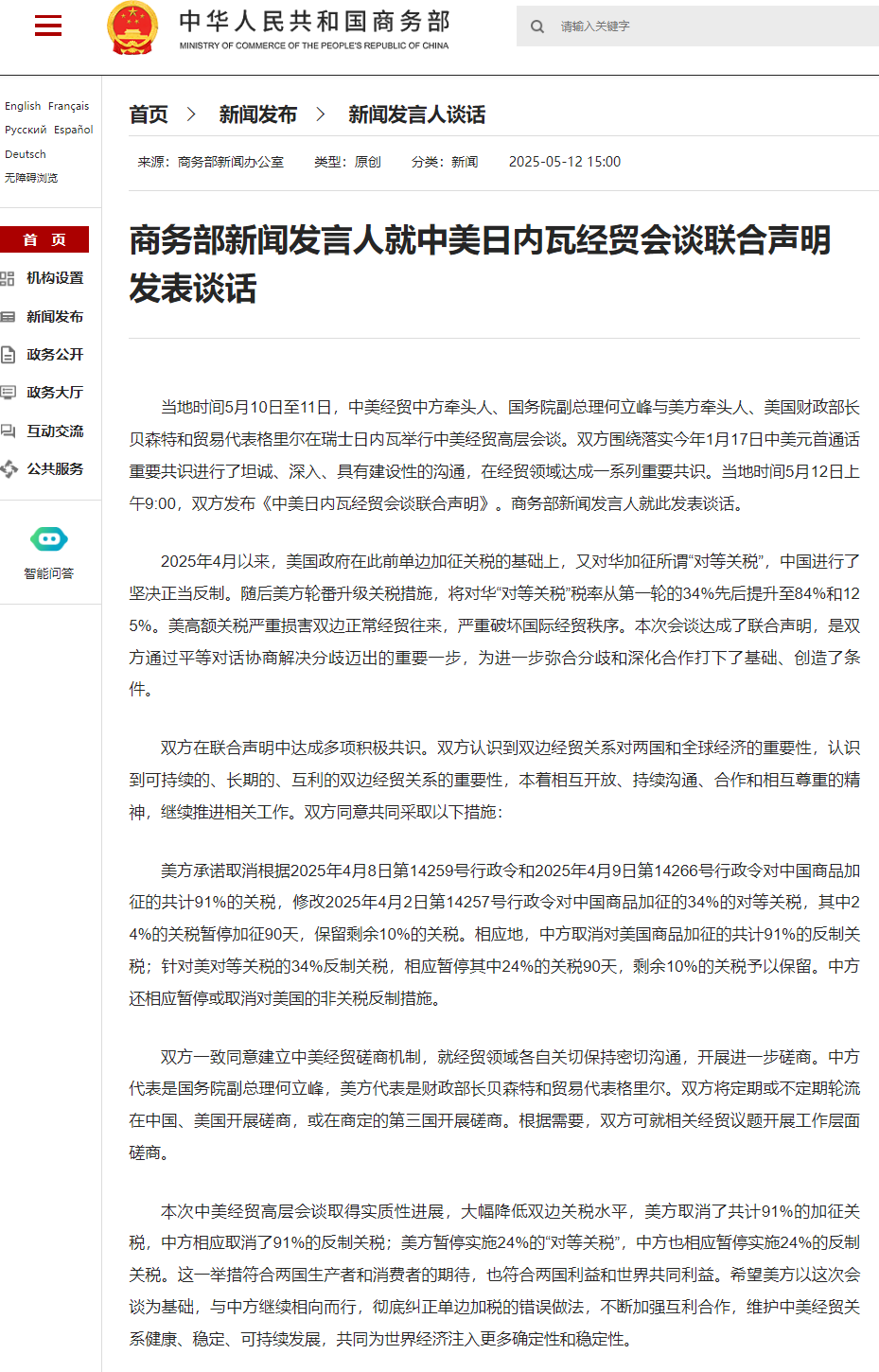 据商务部网站,当地时间5月10日至11日,中美经贸中方牵头人、国务院副总理何立峰与美方牵头人、美国财政部长贝森特和贸易代表格里尔在瑞士日内瓦举行中美经贸高层会谈。双方围绕落实今年1月17日中美元首通话重要共识进行了坦诚、深入、具有建设性的沟通,在经贸领域达成一系列重要共识。当地时间5月12日上午9:00,双方发布《中美日内瓦经贸会谈联合声明》。商务部新闻发言人就此发表谈话。