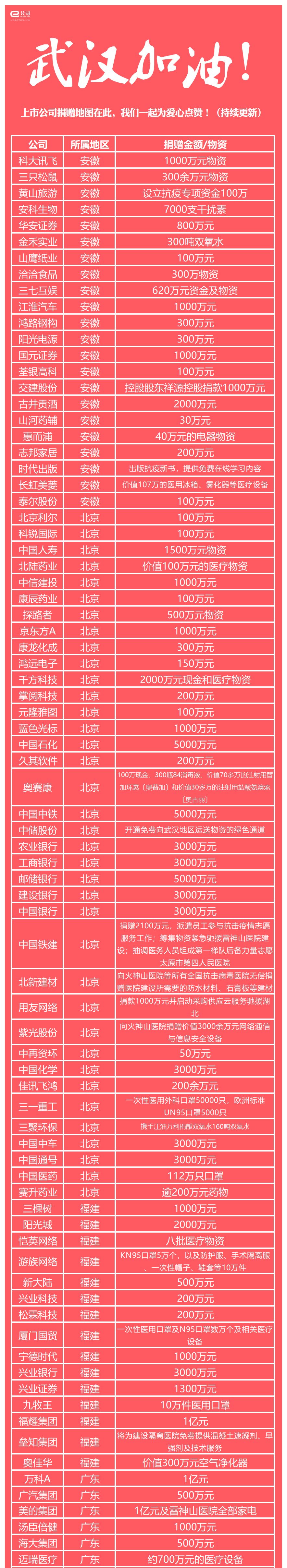 新型冠状病毒感染的肺炎疫情牵动亿万人心。面对这场没有硝烟的战争,上市公司勇当抗击疫情的先锋队和模范军,扛起责任大旗,竞相驰援疫情防控,用关爱和温暖点燃信心,托起希望!