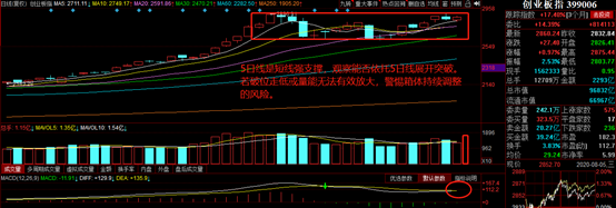 3、今日大概率创业板指将迎来方向选择, 就目前的态势看5日均线处展现出较强支撑,观察今日能否依托5日线展开突破行情,放量大阳线、MACD强势金叉为最优走势。若破位低走,或突破量能不济,需警惕箱体继续震荡的回落风险。西藏药业等妖股虽然今日人气回升,仍需警惕其高位派发风险。