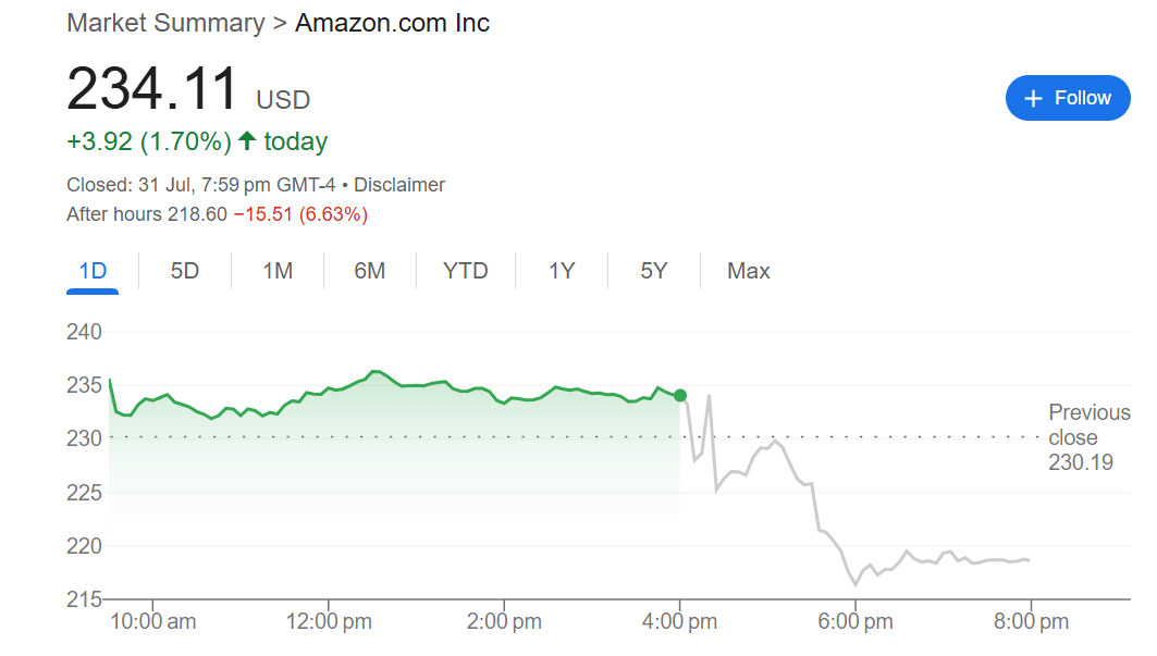 尽管亚马逊财报表现各方面均跑赢分析师预期,但在近期微软、谷歌等美国科技巨头们的一份份“优秀到炸裂”的惊艳财报对比下,亚马逊的财报仍然显得逊色,这也使其股价在盘后下跌了6%以上。