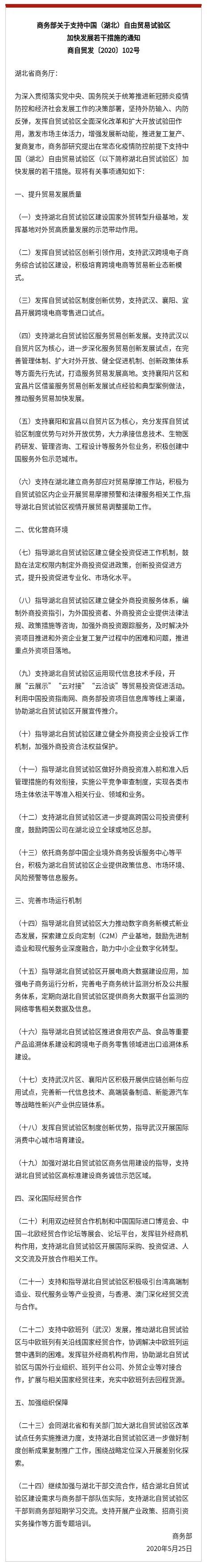 6月4日收盘之后,商务部发布关于支持中国(湖北)自由贸易试验区加快发展若干措施的通知。