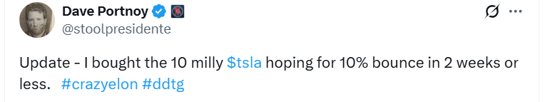 Portnoy在社交媒体X上发帖称,“我买入了价值1000万美元的特斯拉股票,希望在两周或者更短的时间内能够看到10%的反弹。”