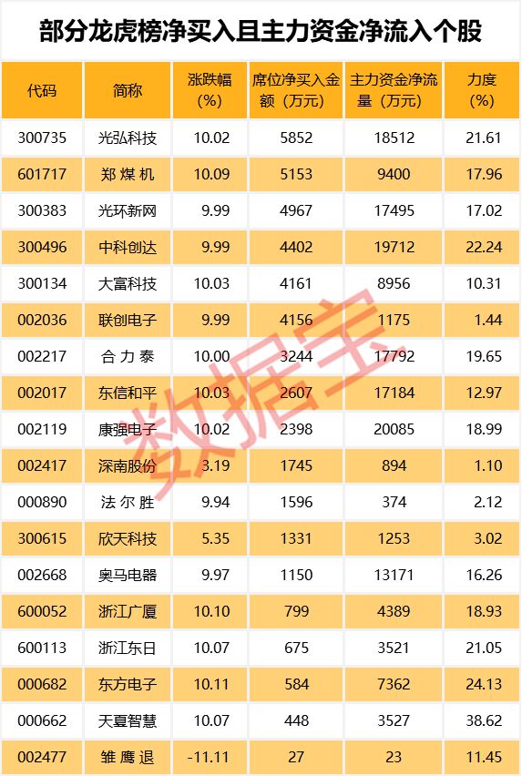 从盘口资金流向来看,主力资金净流入超五千万且龙虎榜净买入个股共有10只,其中康强电子、中科创达、光弘科技等个股资金净流入金额最大。净流入力度最大的个股有天夏智慧、东方电子、中科创达,净流入力度分别为38.62%、24.13%、22.24%。
