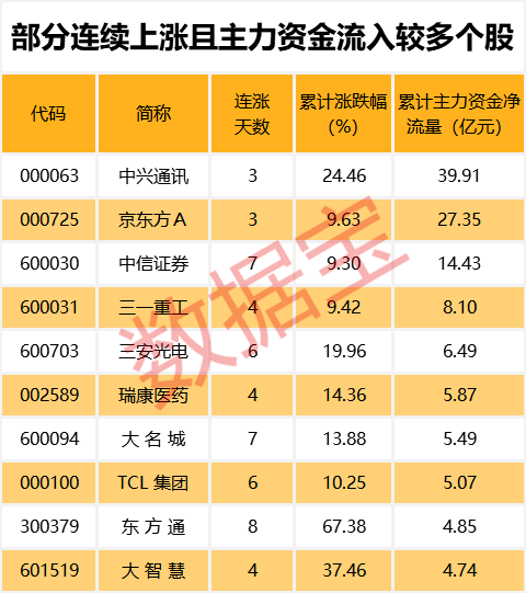 值得注意的是,1312只连续上涨个股中,73只个股期间主力资金累计净流入超过亿元。其中,累计资金流入最多的为中兴通讯,主力资金累计流入39.91亿元。