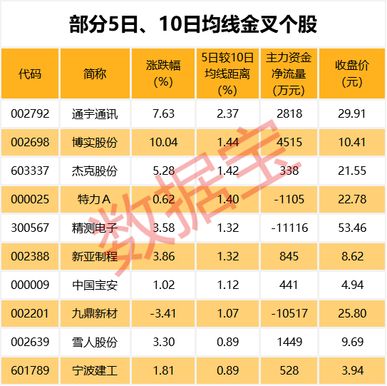 截至9月9日收盘,有75只A股的5日均线主动上穿10日均线,其中通宇通讯、博实股份、杰克股份等个股的5日均线较10日均线距离最大,分别达2.37%、1.44%、1.42%。