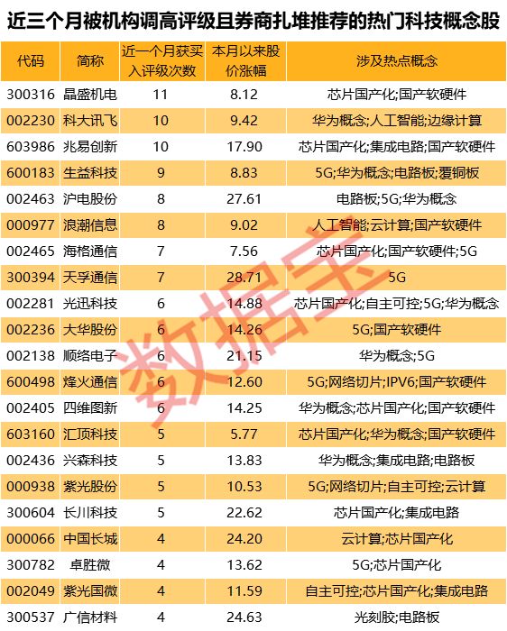 沪电股份、生益科技、四维图新、汇顶科技等个股近三个月内机构评级被调高两次以上。
