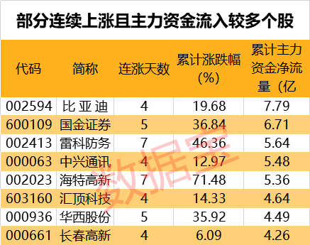 684只连续上涨个股中,55只个股期间主力资金累计净流入超过亿元。其中,累计资金流入最多的为比亚迪,主力资金累计流入7.79亿元。