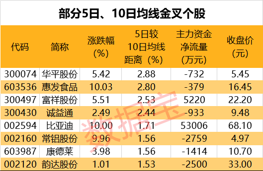 截至最新,有143只A股的5日均线主动上穿10日均线,其中华平股份、惠发食品、富祥股份等个股的5日均线较10日均线距离最大,分别达2.88%、2.8%、2.53%。