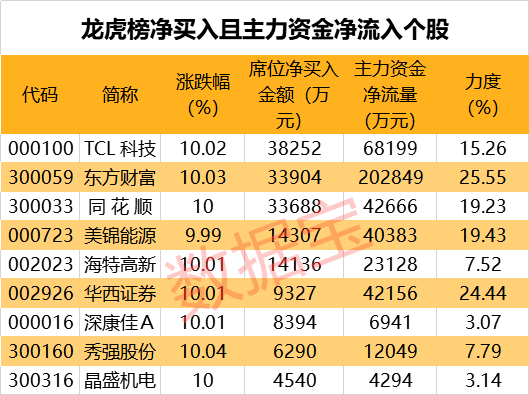 速看!龙虎榜净买入且主力资金净流入个股一览