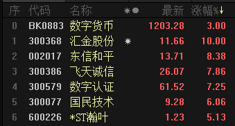 消息发布后,数字货币概念直线拉升,截至午间收盘,汇金股份涨停,东信和平涨超8%,飞天诚信涨超7%,数字认证、国民技术等纷纷跟随上涨。