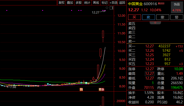 盘初,黄金概念持续走强,中国黄金(600916)4连板,湖南黄金3连板,招金黄金、豫光金铅、飞南资源、四川黄金、赤峰黄金跟涨。