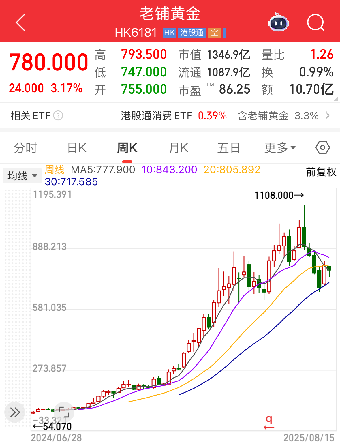 公司自2024年6月成功于香港联合交易所主板上市以来,老铺黄金股价一度表现极为亮眼。股价由发行价每股40.50港元,最高曾攀升至1108港元,累计涨幅近25倍,引发市场高度关注。