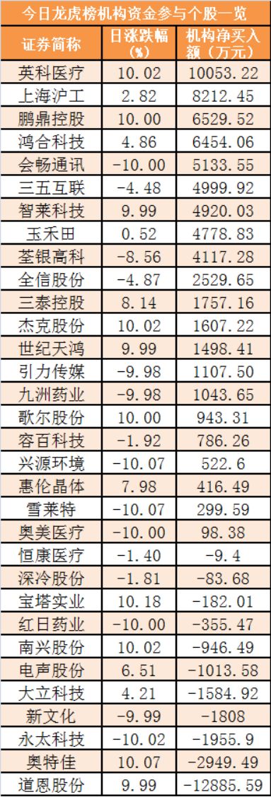 盘后龙虎榜数据显示,机构现身32股,其中英科医疗(30.420, 2.77, 10.02%)等21股呈现机构资金净买入,道恩股份(22.350, 2.03, 9.99%)等11股呈现机构资金净卖出。
