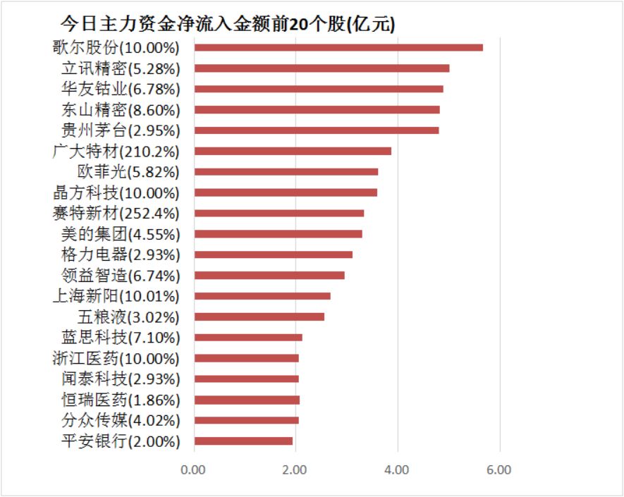 沪深300今日主力资金净流入17.38亿元,创业板净流出58.71亿元,中小板净流出66.11亿元。沪股通净流入21.64亿元,深股通净流入3.21亿元(本文中沪股通、深股通净流入额以当日已用额度来计,与成交净买入额略有差异,但表示的意义大体一致)。