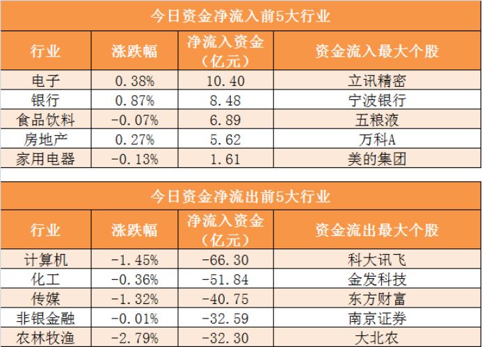 28个申万一级行业中,5个行业实现资金净流入,其中电子行业净流入10.4亿元居首。